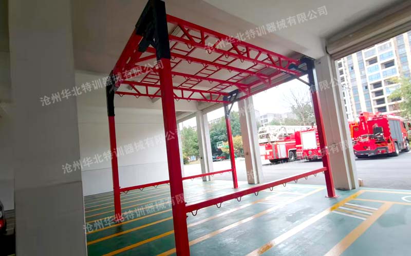 该训练架整体尺寸可根据车库实际空间灵活调节:长5.2米、宽3.9至4.9米可调、高3.8至4.3米可调,能够在车库内灵活部署,不影响消防车辆的日常停放与紧急出动。主体采用Q235高强度钢材,结构稳固可靠,配备可调节悬挂点与多种强度等级的绳索,满足不同层级训练需求。